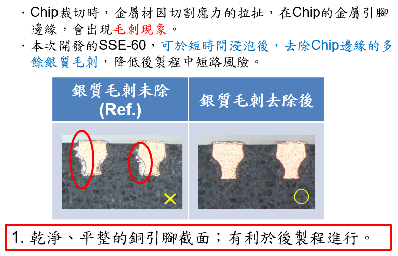 1. 雙劑型操作 2. 可快速去除因切割製程出現之銀質毛刺 |